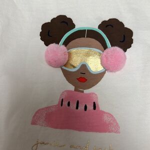 For apres ski, or anytime, our soft cotton tee with a screenprinted girl wearing plush pom earmuffs, plus metallic details.