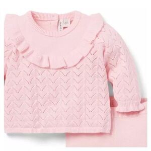 Get set for first moments with our soft sweater set in pure cotton. Featuring an allover textured pointelle knit, plus ruffle details at the front, cuffs, and hem.