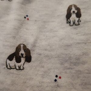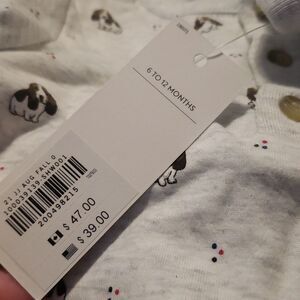 Brand new with tags from Janie and Jack! Romper has a grey color with cute puppy print. Buttons on the top and snaps between the legs. Very cute and cozy!
