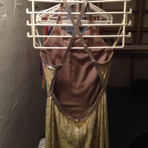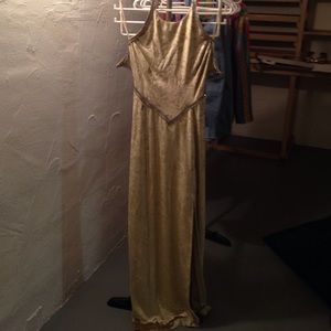 Beautiful shiny stretchy fabric. Feels like a thin soft fur with silver threads so embedded you just see them glimmer with movement. Extremely high quality. Was over $1,000 new. I think about $3,000? Italy boutique Neutral color look very beautiful upon any skin color. You will really enjoy this one knowing the thousands that were paid for it. You will see the quality when you get it. Long but sexy leg slot which does not stay open but when you walk allows a classy sexy look.