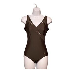 Janine Robin Swarovski Jeweled French One-Piece Swimsuit Sz 10 Brown Low-Back