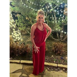 Made of 92% polyester and 8% spandex. Features a tie around the neck with gold chain hardware, elastic at the hips, wide leg, and is a bright cherry red. Laying flat measures about 16" put to pit, 13" in the waist and stretched. 8" rise, and 32.5" inseam.