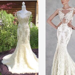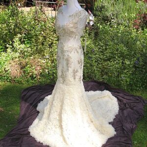 Details: Lace/Tulle, Cap sleeves, Sheer upper bodice with floral applique, Full length hem with back train