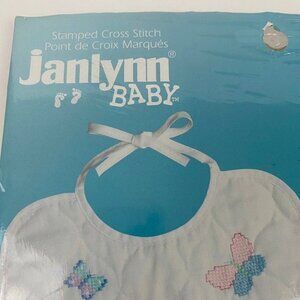 Janlynn Baby Stamped Craft Cross Stitch Kit Sleepy Bunnies Bibs. Contains 2 screen printed prefinished quilted bibs, graph, and instructions. Floss requirements on back list (no floss included). From 2004. New in package. Would be very cute for Easter with the bunny rabbit details.