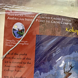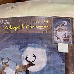 Janlynn Counted Cross Stitch Carft Kit Kokopelli Christmas #126-24 - design from 2000/Y2K - Native American Holiday Theme - NEW in packaging. Kit includes instructions, cloth, floss, etc needed to complete your project. Finished size is 14" x 21".