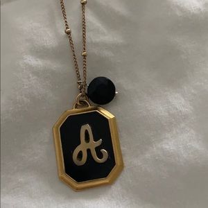 This letter A necklace is black with gold writing and a gold chain. It has one clasp to open and close the necklace. It is in great condition!