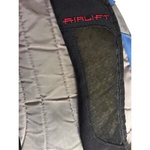Preowned Jansport Airlift backpack in blue and black. Approx. 18" tall x 14" wide x 6" deep. Features padded Airlift straps, front compartment, large main compartment, and gray interior lining.