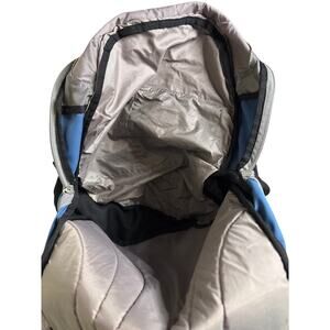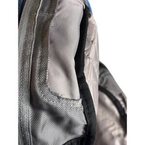 Overall good usable condition with cosmetic wear. Light blue staining on the lower front left area and some discoloration on the gray interior (shown in photos). Zippers work well, straps adjust smoothly, and interior lining is fully intact.