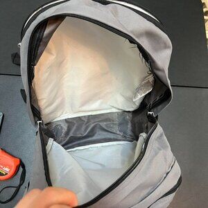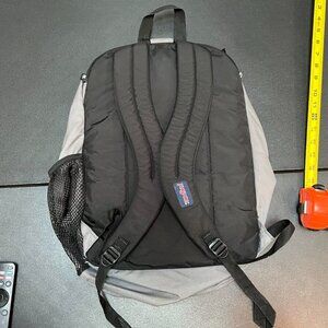 Pre-owned Jansport Big Student backpack in gray. Features two spacious compartments, an extra padded pocket for a laptop, and a front organizer pocket. Durable design with padded straps for comfort. Comes as is, see photos for details.