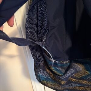 Large Jansport backpack, 2 parge interior pockets, plus 3 outside zippered pockets. Slight wearing on pattern (Picture) and slight tear on the bottom of one strap (picture). Colors are blue and yellow pattern on black background.