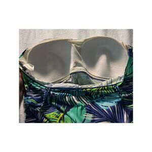 Make a splash with this Jantzen Classics swimsuit top in size 22W, featuring a vibrant tropical palm leaf print in shades of blue, green, and teal. Designed with ruched sides, wide adjustable straps, and a supportive built-in shelf bra for a flattering and secure fit. This tankini-style top offers excellent coverage and style for beach days, poolside lounging, or resort vacations. Excellent preowned condition. See photos for condition details.