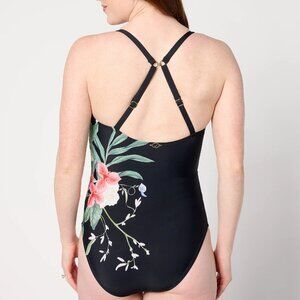 Features: one-piece, adjustable shoulder straps, shelf bra with underwire, removable bra cups, twist back detail, silhouette-smoothing stomach panel, center-front shirring