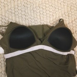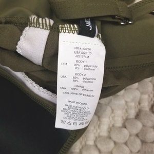 Elegant olive green one-piece swimsuit. Features a flattering wrap design. Adjustable straps for comfort.