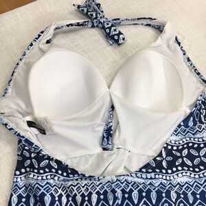 Jantzen Swimsuit One Piece Women Size 12 Halter Plunge Blue White Printed Beach