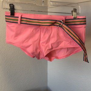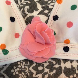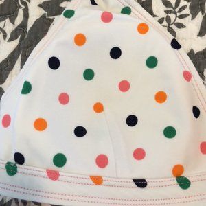 Adorable bikini purchased from Victoria's Secret in the 2003-2006 time range. It has never been worn and is in excellent condition. Bottom has belt loops and a cute belt; they measure 28.5” in diameter around the top of bottom without being stretched. Top is halter style; ties at top and hooks in back. It's white with multicolored polka dots and a pink flower at the center. It has removable foam modesty pads.