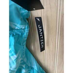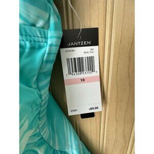 This is a women's one-piece swimsuit by the brand Jantzen. It is in a solid teal color with a surplice design and features a palm pattern. The swimsuit is a size 10 and made of polyamide material.