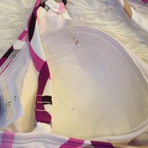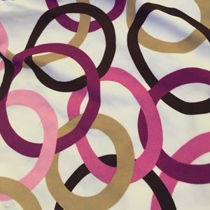 NWT Jantzen white tankini top with brown, purples, and tan circles. Racerback straps adjust to tank style with built in padded bra. There is a small spot as seen in photo on inside cup. Bought like this. Different size bottoms listed.