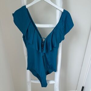 •This elegant blue swimsuit from Jantzen features a playful ruffled neckline and shoulders, creating a fluttery cap sleeve effect. The plunging V-neckline with a lace-up detail adds a touch of sophistication, while the high-cut leg line ensures a sleek silhouette.