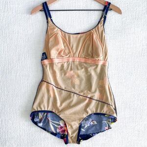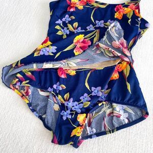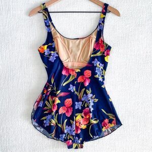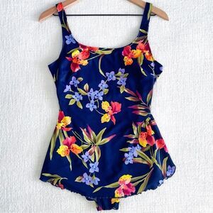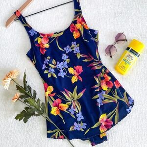 Vintage swim dress by South Point, a division of Jantzen. Classic tank-style cut top, accented waist, fluttery swim skirt, and built in bikini bottoms. Tropical floral pattern on a deep blue background. Minimal signs of wear- excellent vintage condition. No pilling, not even on the bottoms! Size and material tag is no longer attached, would best fit a medium.