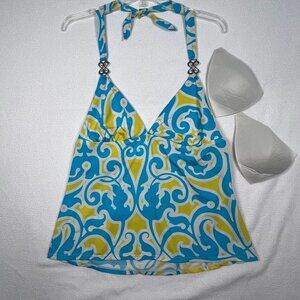 Jantzen Women's Size 14 Halter Swim Tankini Top Metal Accent Blue Yellow Floral