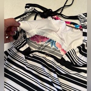 Jantzen black & white striped with bright pink & blue flower print tankini top. 92% polyester & 8% elastane.Sz6 pre owned in excellent condition.