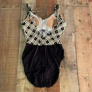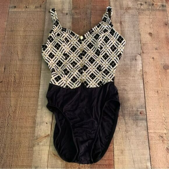 Jantzen women vintage black white and gold geometric shaped one piece swimsuit