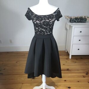 January 7 Black High Low Dress Large Lace Overlay Bodice Pleated Full Skirt Prom