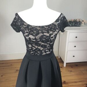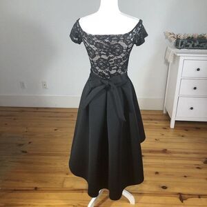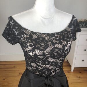 Very pretty special occasion dress. Stretchy black lace overlay bodice with a full pleated hi-low skirt. Tie at waist can be worn front or back. Neckline comes to edge of shoulders. The skirt has lots of body. Comfortable fit. Made in the USA. Large (runs a bit small but has good amount of stretch). No holes or stains. Normal wear.