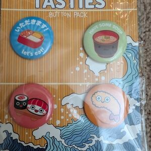 Set of four colorful Tokyo Tasties buttons. Features fun food-themed designs.