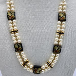 Japan Faux Pearl & Black Floral Painted Lacquered Square Bead Necklace