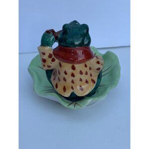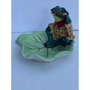 This mid-century porcelain frog figure from Japan offers a touch of whimsical charm to any collection or decor. Crafted with precision, this collectible showcases a frog in vibrant attire, perched atop a leaf.