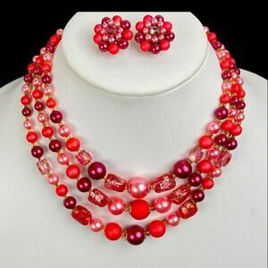 Japan Necklace Clip On Earring Set Multi Tone Pink Bead Gold Tone Collar Choker