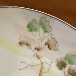 Vintage, made in Japan, small, hand-painted, porcelain, wall hanging plate. The plate measures about 5.5 inches in diameter. The front features a landscape, nature scene. The back has pre-drilled holes and a wire hanger. There are not cracks are chips. In good pre-owned condition.