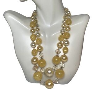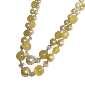 Japan Yellow Crackle Beaded Graduated Faux Pearl 2 Tier Silver Tone Necklace 16”