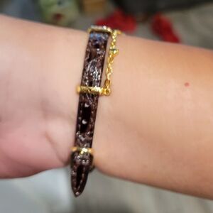 it does not have a battery and I couldn't open it to see what it needed to be changed. selling as is. never used. genuine leather.this is for a small size wrist preferably
