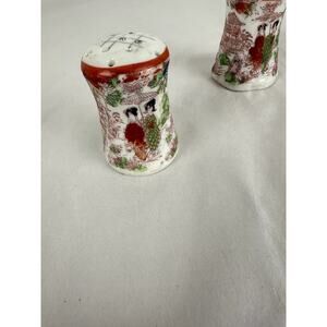 Japanese Antique China Salt and Pepper Shakers 1921-1941.. Both show sign of wear due to aging and use. The old corks are still in the shakers, but new ones will be included in the purchase. . They are about 3" tall and show the typical Geisha, floral and structure pattern. Refer to photos for details.