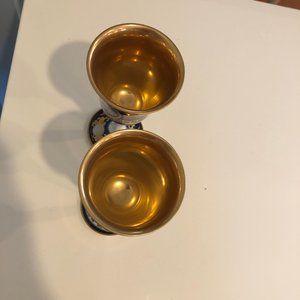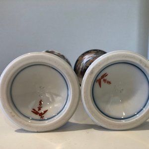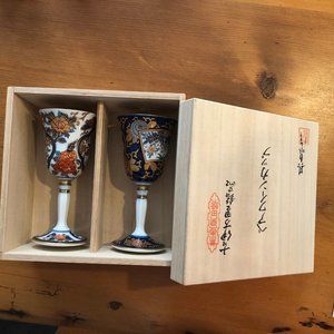 Brand new, never used set of two Japanese Arita porcelain Imari wine glasses. Beautiful designs with gold and polychrome overglaze. This set won the Grand Prix and Grand Prize in the Luxury Japan category at the Japanese Souvenir contest in 2010. Measure approximately 6” tall, 3” diameter.
