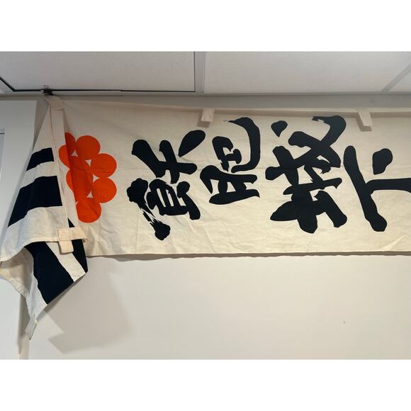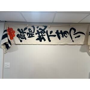 This is a beautiful, hand-painted Japanese banner featuring a phrase regarding "No ego under the prosperous castle." The banner is in good condition and would be a wonderful addition to any home or collection. It measures 116" x 20".