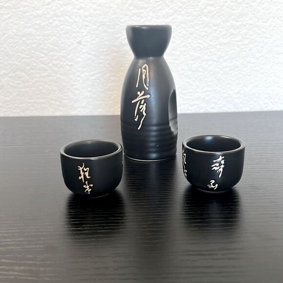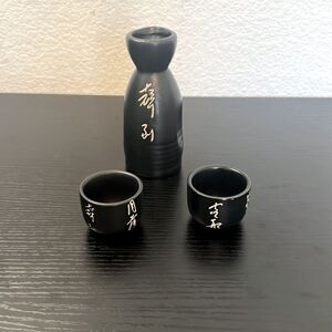 Japanese Black Ceramic Sake Set with Sake Flask and Two Cups