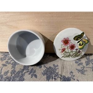Top of trinket box shows pink, red and purple flowers with green and beige stems and leaves. There is a TINY and adorable ladybug on one of the leaves.