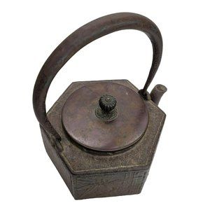 Japanese Cast Iron Teapot Copper Signed Hexagonal Antique Tetsubin CT407