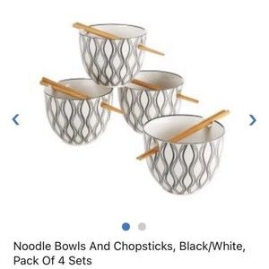 Japanese Ceramic Ramen Udon Noodle Bowl Set of 4 w/ Chopsticks Black & White beautiful bowl set