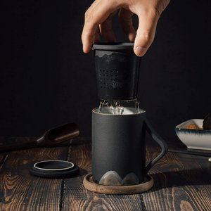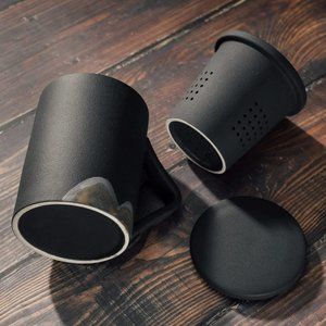 Ceramic tea cup with removable filter and top. Easy to infuse loose leaf tea, plus looks unique and decorative.