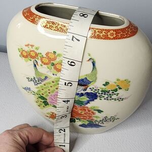 This stunning Japanese vase features a peacock design with floral accents on a cream background, created in the Satsuma style. The item was made in Japan and is perfect for collectors of Asian and Japanese cultural items. The vase is an oval shape and measures [insert dimensions] and is ideal for displaying as a decorative piece in any home or office.