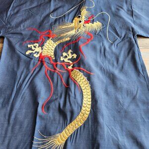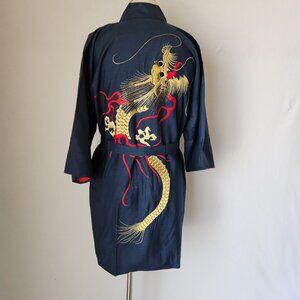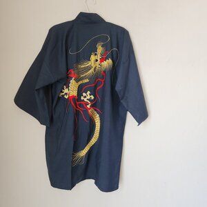 Japanese Dragon Embroidered Silk Kimono Robe Belt Blue Men's Made in Japan