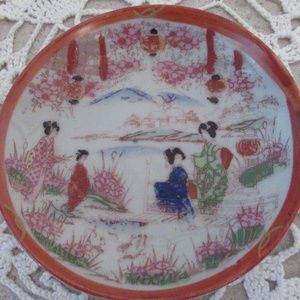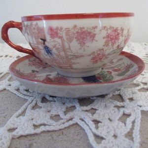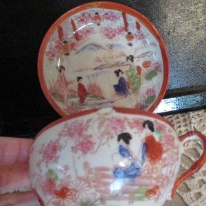 Vintage Japanese Eggshell Teacup & saucer. Red trim, Geisha girls, hand painted