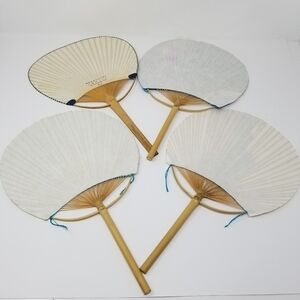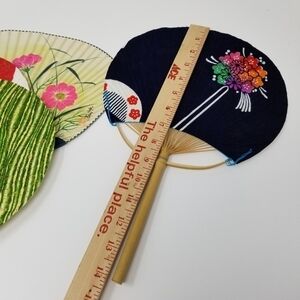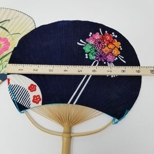 Japanese Flat Fan Hand Held Bamboo Handle Set of Four Floral Nature Color Block