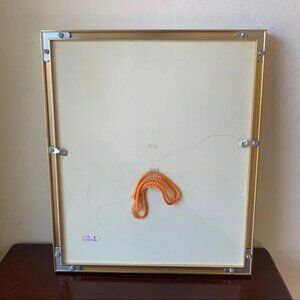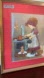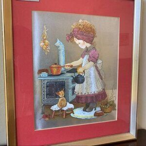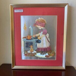 Japanese Framed Metallic Foil Art Print Vintage Girl Cat Cooking Silver