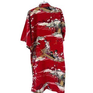 This vintage Japanese kimono robe showcases a stunning red base color adorned with intricate floral and geisha patterns. Crafted with care, this robe offers a touch of traditional elegance, making it a sophisticated addition to any wardrobe.