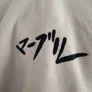 - Unique beige hoodie with Japanese characters and bold multi eyed fox graphic